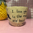 Er du på udkig efter noget helt særligt? Falkeblik laver eksklusive, håndlavede og håndmalede kopper, der ikke bare er funktionelle – de er små kunstværker - den her med "I love you to the moon"! Hver kop er skabt med kærlighed og omhu af dygtige Susie, hvilket gør dem til en unik og uundværlig del af dit hjem. Når du vælger en kop fra Falkeblik, vælger du ikke bare kvalitet, men også en historie bag hvert enkelt design.