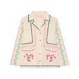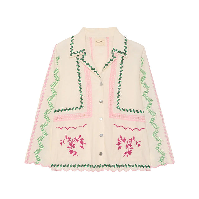 Skjorten er smukt dekoreret med bølgede blondebånd arrangeret i horisontale og vertikale mønstre, blomsterbroderi på lommerne samt fine, bølgede kanter afsluttet med broderi.