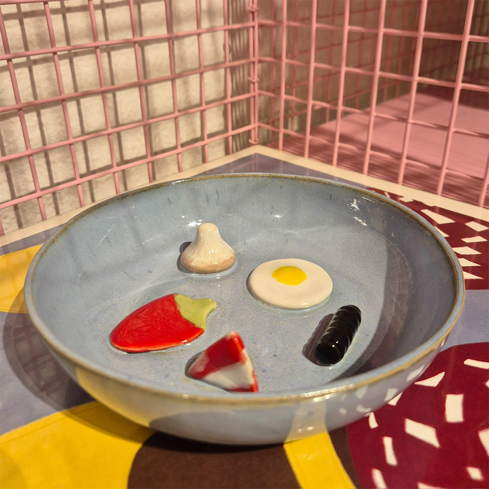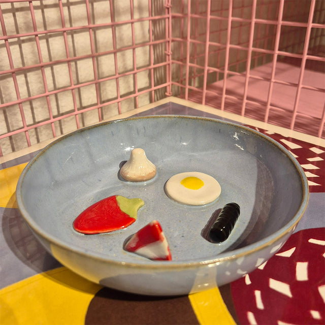 Skålen er håndlavet med omhu, og det fastgjorte keramik slik tilføjer en sjov detalje, der ser realistisk og farverig ud. Den er ideel til servering af små snacks eller som en quirky dekoration på spisebordet, køkkenhylden eller i stuen. Uanset hvor du placerer den, vil den med garanti fange opmærksomheden hos både gæster og familie.