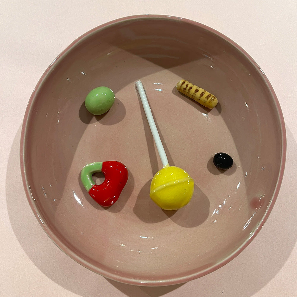 Skålen er håndlavet med omhu, og det fastgjorte keramik slik tilføjer en sjov detalje, der ser realistisk og farverig ud. Den er ideel til servering af små snacks eller som en quirky dekoration på spisebordet, køkkenhylden eller i stuen. Uanset hvor du placerer den, vil den med garanti fange opmærksomheden hos både gæster og familie.