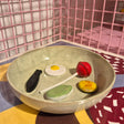 Skålen er håndlavet med omhu, og det fastgjorte keramik slik tilføjer en sjov detalje, der ser realistisk og farverig ud. Den er ideel til servering af små snacks eller som en quirky dekoration på spisebordet, køkkenhylden eller i stuen. Uanset hvor du placerer den, vil den med garanti fange opmærksomheden hos både gæster og familie.