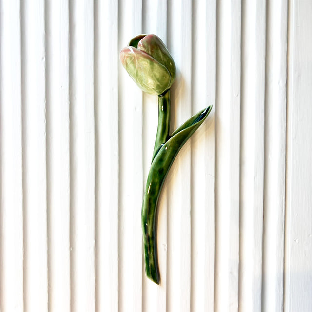 Leder du efter noget særligt til dit hjem? En håndlavet keramik tulipan, i lysegrøn med et strejf af rød, til væggen er den perfekte løsning.