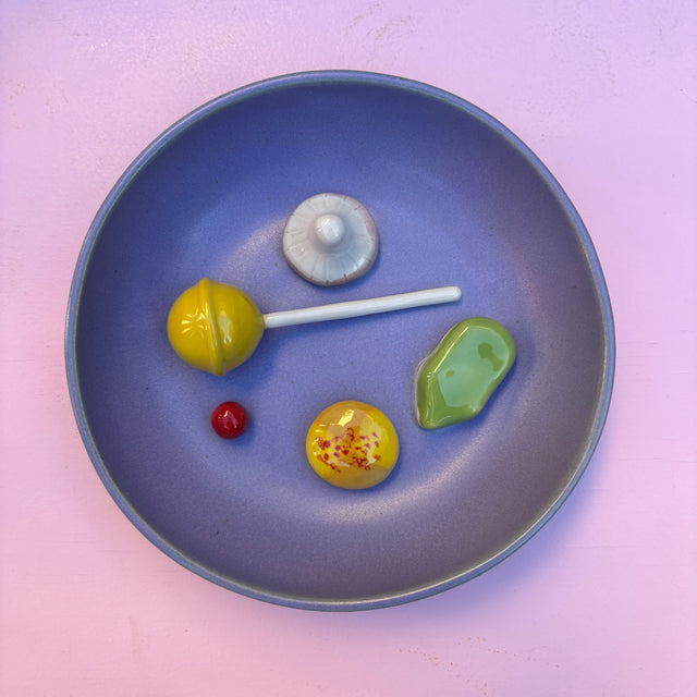 Tilføj et kreativt og legende element til din boligindretning med vores keramik slikskål med fastgjort keramik slik fra Julie Ebens. Denne unikke slikskål er både perfekt til fredags-slik og en dekorativ samtalestarter, perfekt til at give dit hjem et personligt præg. Slikskålen er en unika, og lige præcis denne har de fineste slikdetaljer, der bl.a. dækker over en gul slikkepind og en grøn skumfrø.