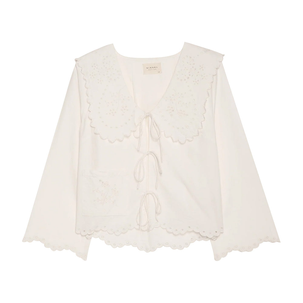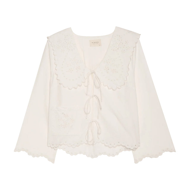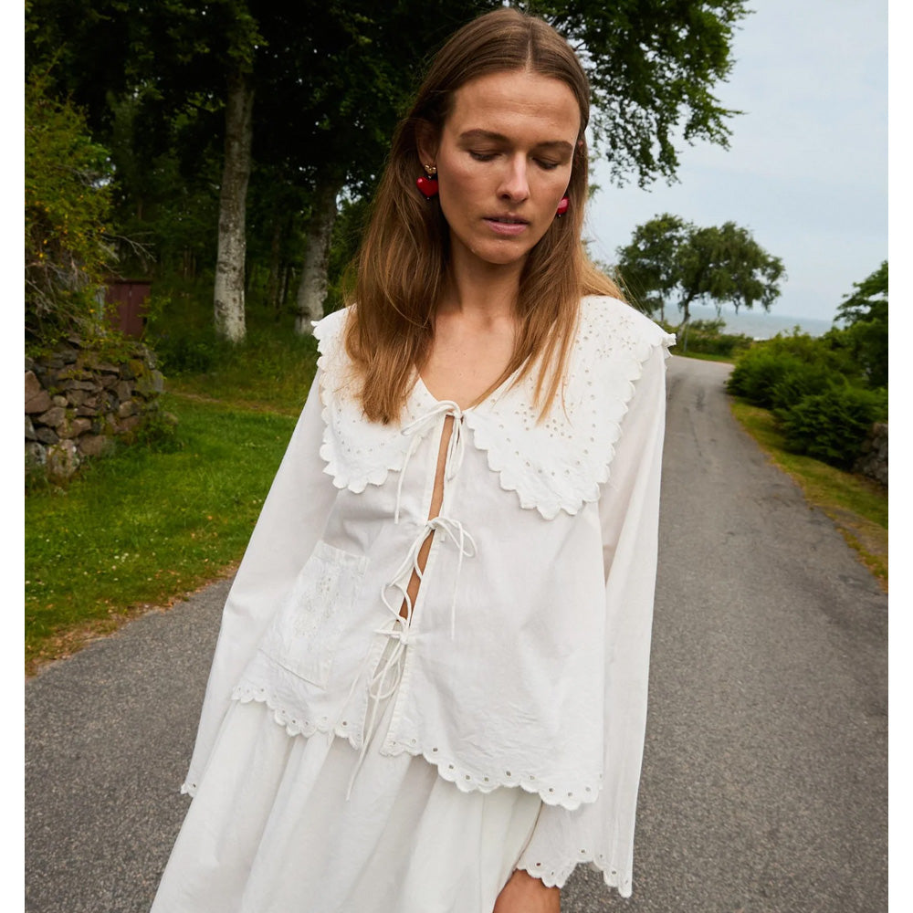 V-halsen er fremhævet af en markant, oversized krave, som tilfører karakter og et strejf af vintage-inspiration. Foran er toppen lukket med tre sæt fine bindebånd, der giver et feminint og justerbart look. Elly Top er rigt dekoreret med cutwork-broderi inspireret af en vintage dug, placeret på kraven og forlommen. De broderede, bølgede kanter langs nederste kant og ærmemanchetter fuldender det håndværksprægede design. Elly Top er det perfekte valg for dig, der ønsker en bæredygtig top i økologisk bomuld med romantiske detaljer, kunstnerisk broderi og et eksklusivt udtryk.