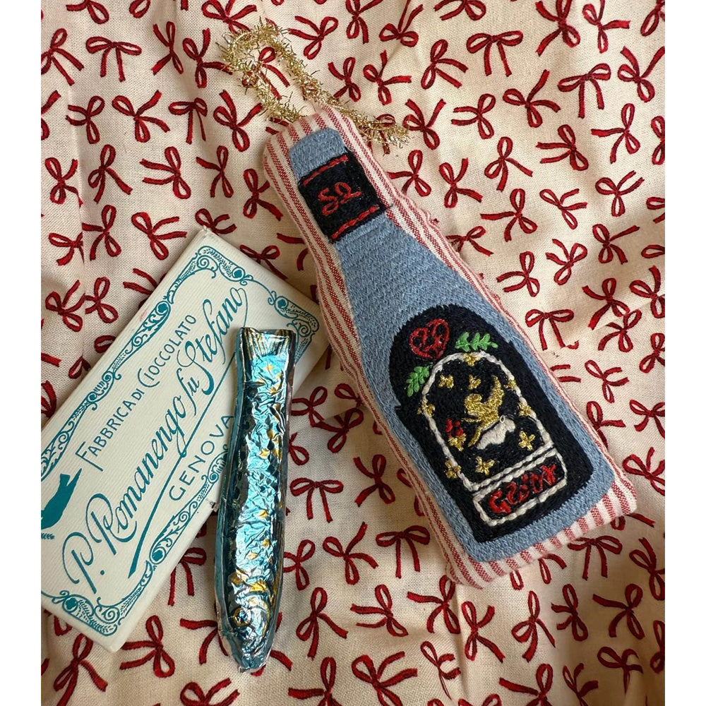 Skab ægte dansk julestemning med dette unikke Christmas Bottle ornament! Håndlavet af reststof og let polstret for et blødt udtryk, prydet med detaljeret broderi af en klassisk gløggflaske – en elsket, traditionel julekrydret drik i Danmark.