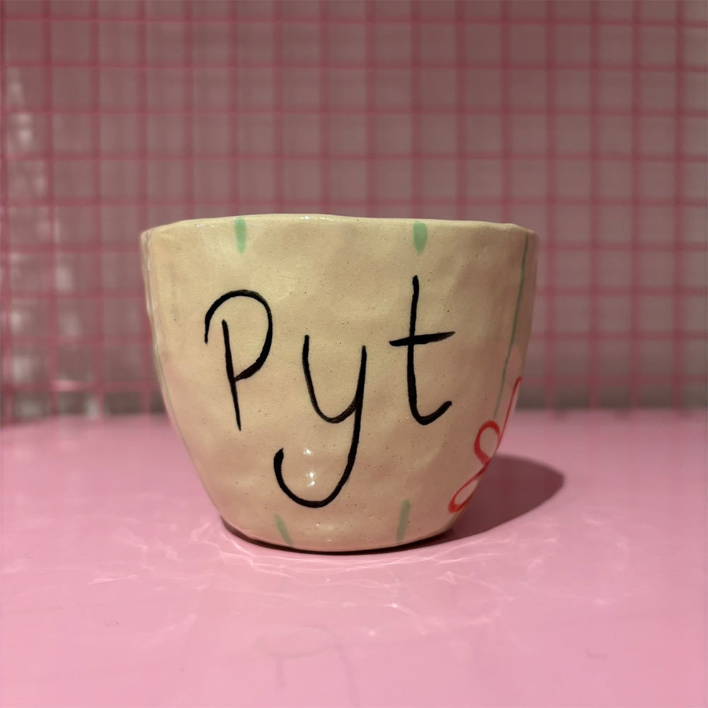 Falkeblik Keramik Kop Cortado “Pyt” Blomster er en hjertevarm, håndlavet lille kop, der hylder ro, nærvær og den klassiske danske pyt-mentalitet. Med sin perfekte cortado-størrelse er koppen ideel til espresso, cortado og små teportioner, mens det enkle og poetiske design gør den til en smuk del af enhver kaffestund. Teksten “Pyt” kombineret med fine blomsterdetaljer skaber et opløftende udtryk, der minder dig om at slippe det små og nyde øjeblikket.