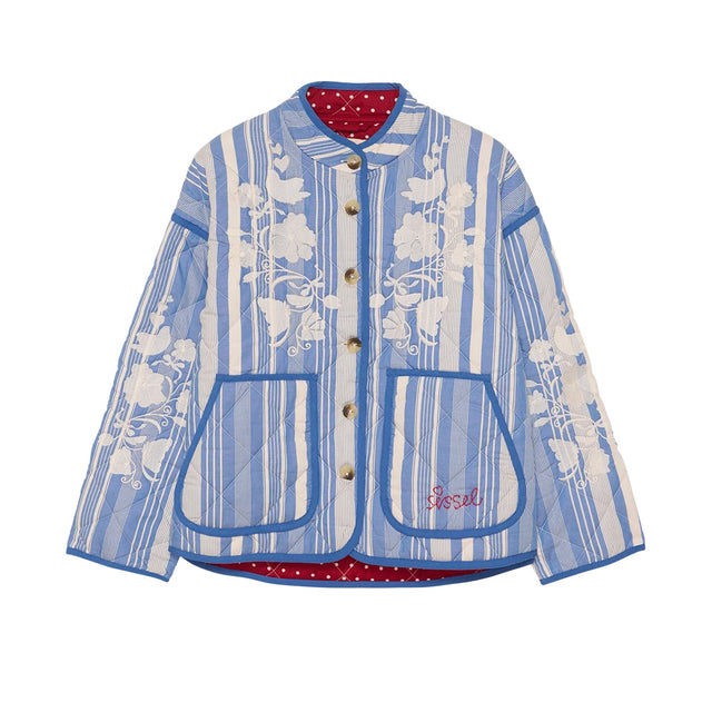 Jakken er fremstillet af overskydende bomuldsmateriale, hvilket understøtter en mere ansvarlig produktion og et bevidst materialevalg. Det quiltede yderstof er kombineret med et prikket for i et diskret ternet mønster, som tilfører dybde og karakter til designet.